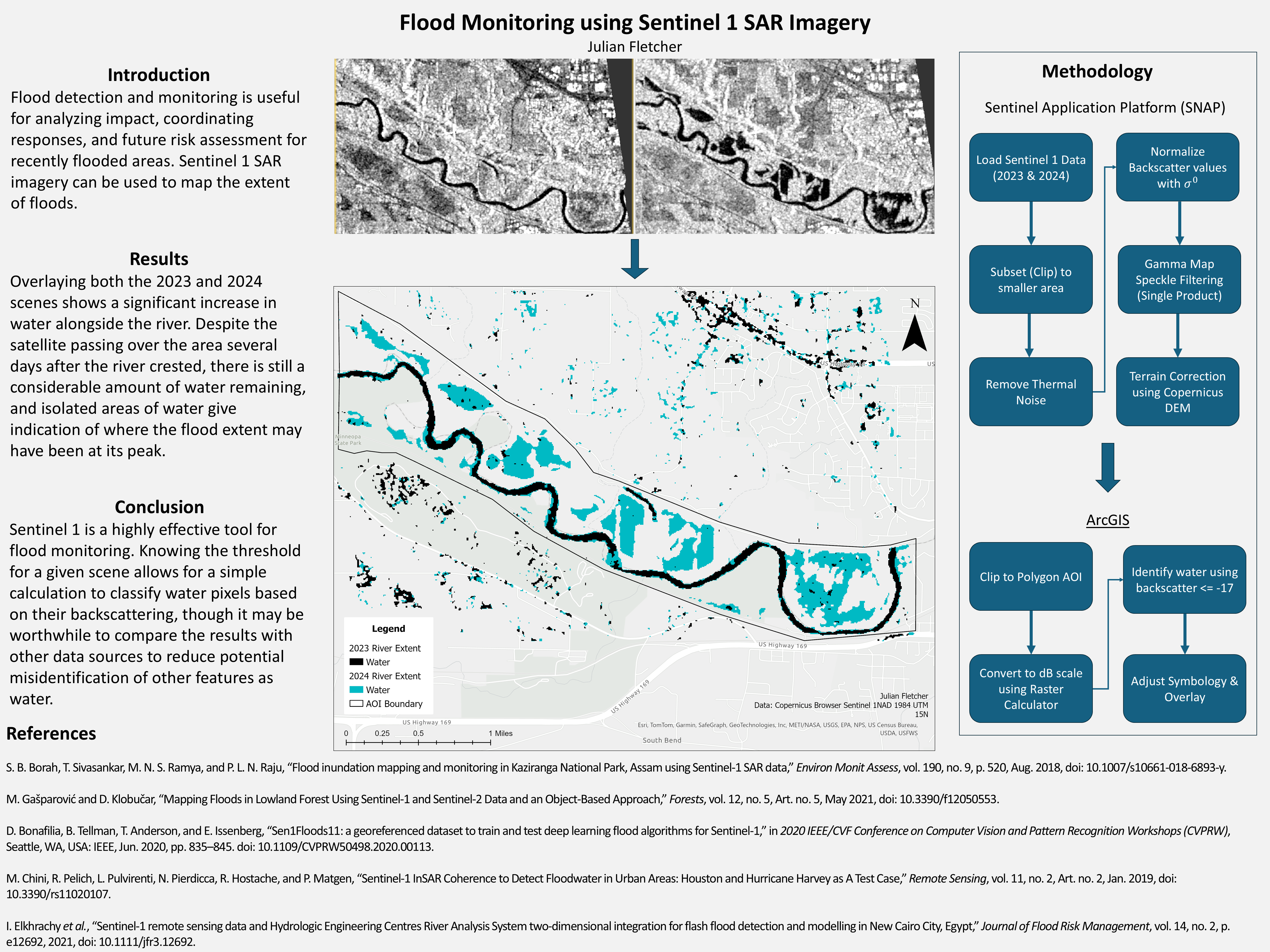 This was a class project for Geography 3380: Intro to Remote Sensing. In this project I utilized Sentinel-1 SAR data to detect and map flooding near Mankato, Minnesota along the Minnesota River in 2024. My workflow included the Sentinal Application Platform (SNAP) and ArcGIS Pro to process and display the SAR data from both 2023, and 2024. After classifying water pixels in ArcGIS, I overlayed the 2023 and 2024 imagery to effectively map the extent of the flooding along the river. You can view the full project poster here.